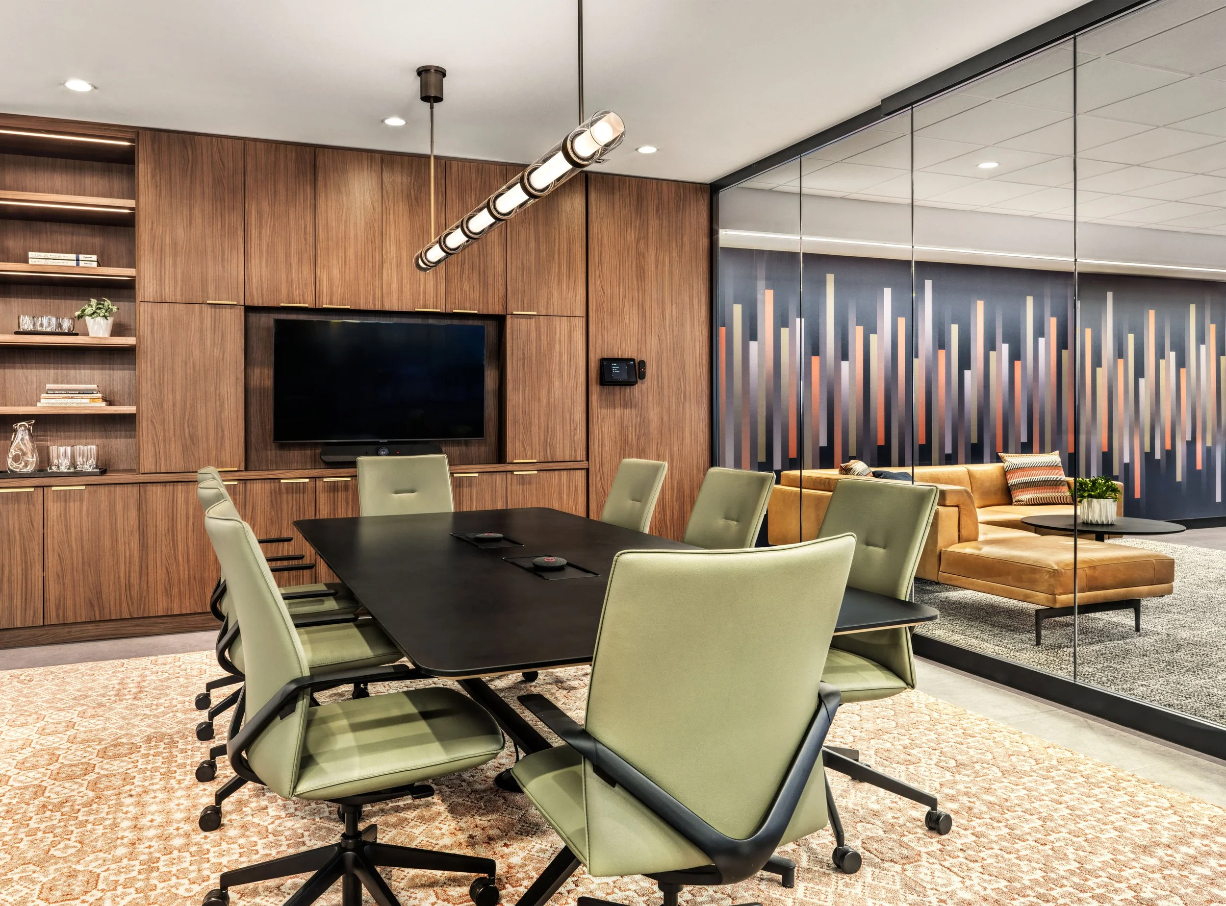 From vibrant wall graphics to striking lighting fixtures, the new space strikes a balance between modern design and the client's more traditional brand expression. Comfortable, varied seating arrangements accommodate a range of meeting styles and user needs. A self-serve kitchen offers convenient access to meals without leaving the workplace, encouraging team members to stay on-site, connect, and engage beyond their usual work areas.