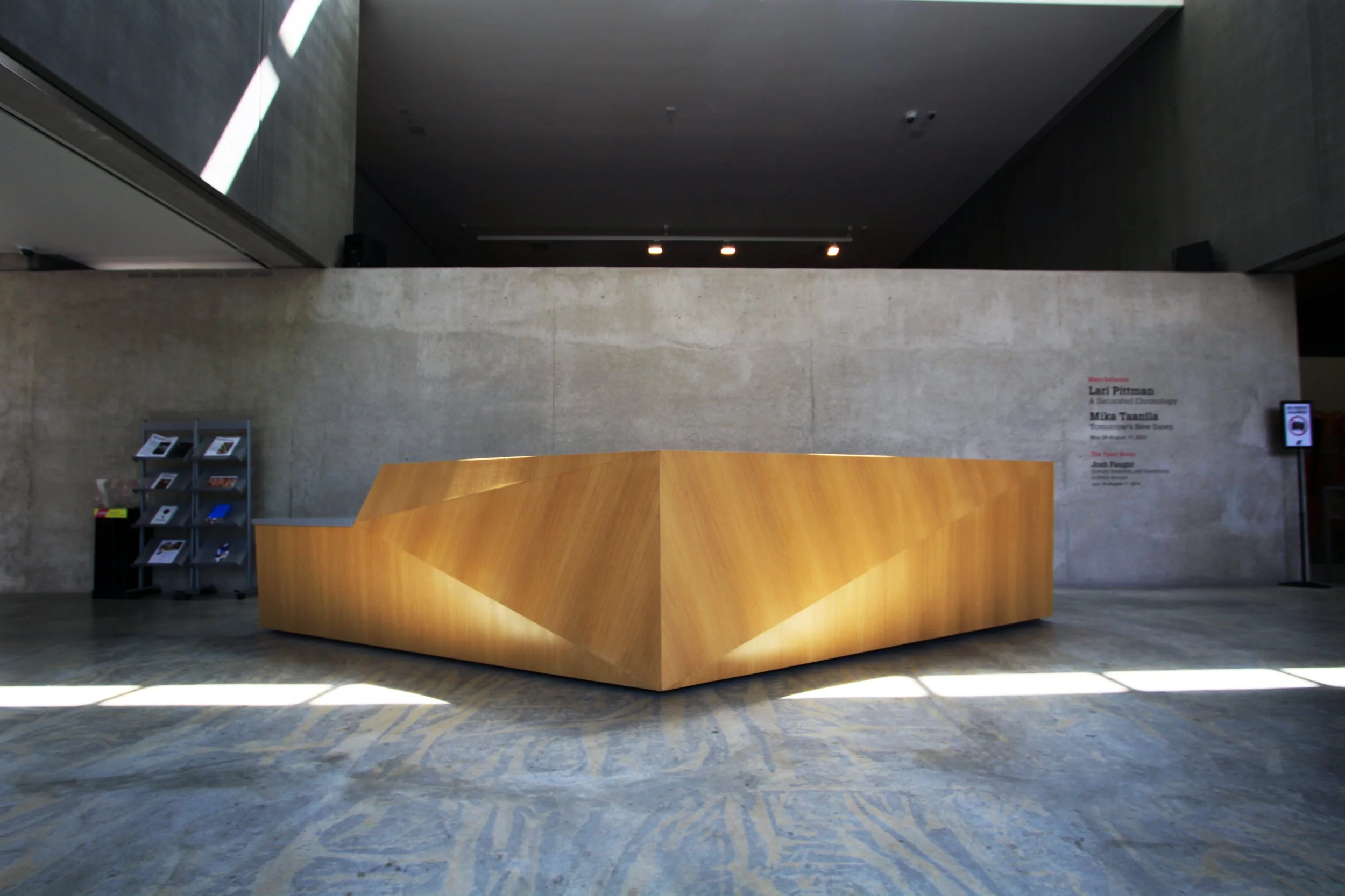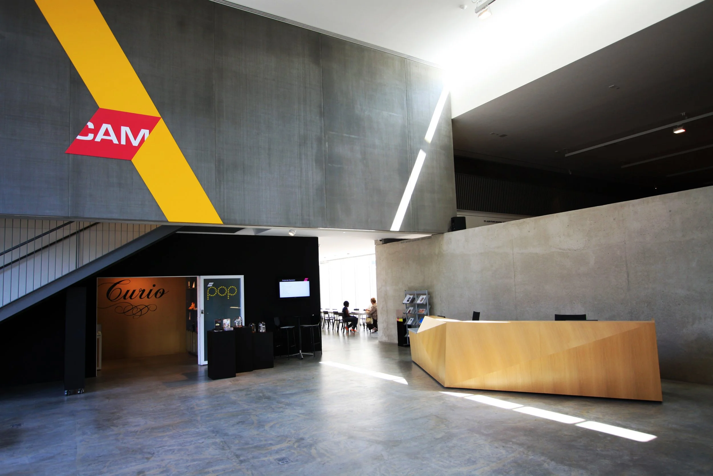 Arcturis worked with CAM to redesign and relocate their main lobby desk. The lobby serves CAM in several different ways and the new desk had to meet those needs while being a special piece of modern design itself. Arcturis studied multiple locations within the lobby and mocked up various shapes of the desk. The location along the south concrete wall is ideal to welcome visitors, check guests in at events, and for staff to monitor various spaces from the desk. The canted shape allows for flow around the desk while evoking a sense of movement. Special attention was paid to the detailing of the desk, materials used, and how people would interact with the desk. The lighter wood tone brings warmth into the mostly grey space but is not so bold to take away from adjacent art. The team visited the millwork shop during fabrication to work out details and determine the orientation of the wood veneer on the canted faces.