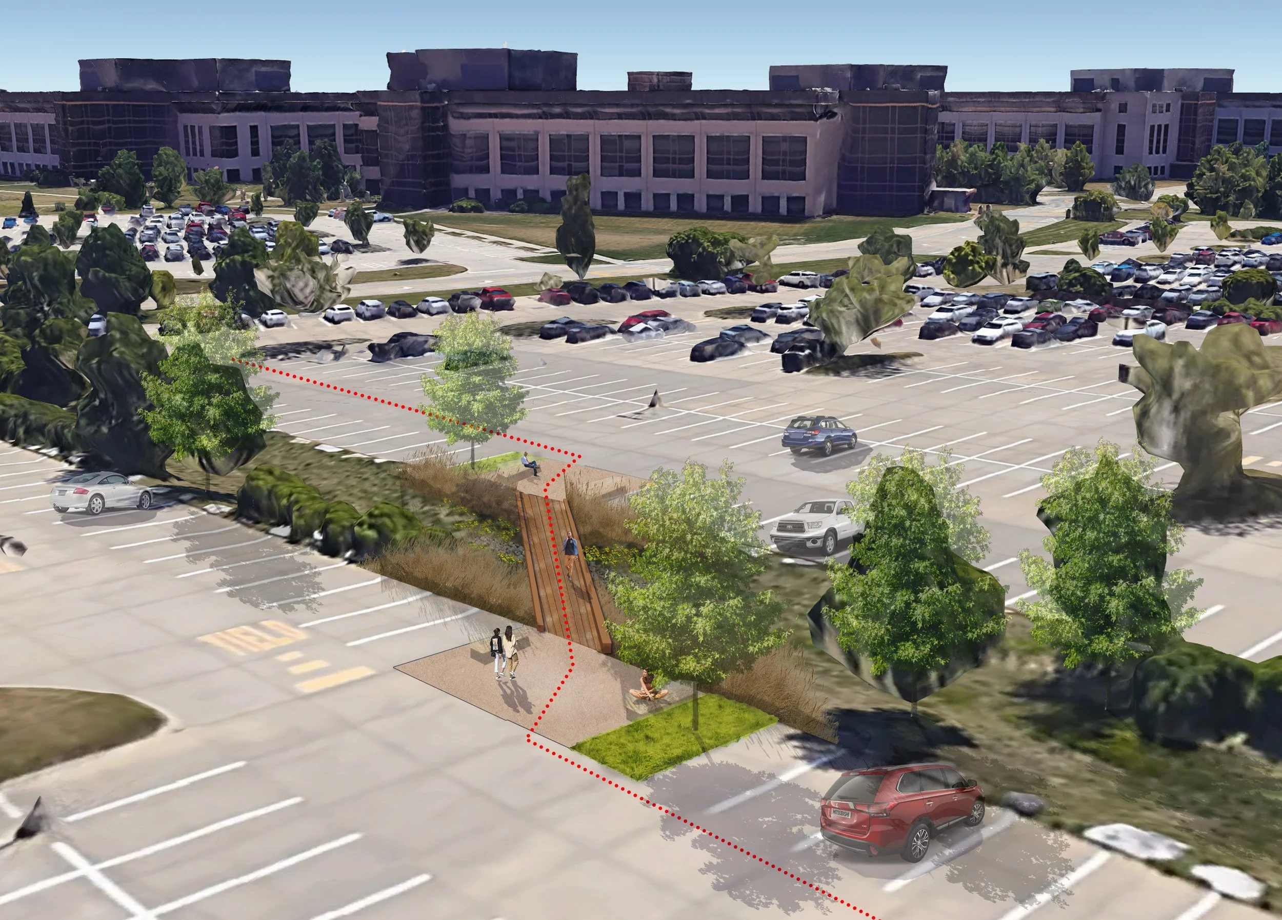 Arcturis was engaged by a corporate client to help reimagine their 100+ acre campus with a focus on improving the everyday experience of their employees. The current layout prioritizes vehicles, resulting in long walks from parking areas to building entries—an issue worsened by harsh winter conditions and large areas of depressed, disconnected landscape. These challenges contribute to a fragmented environment that lacks intuitive pedestrian access, weather protection, and engaging outdoor spaces.