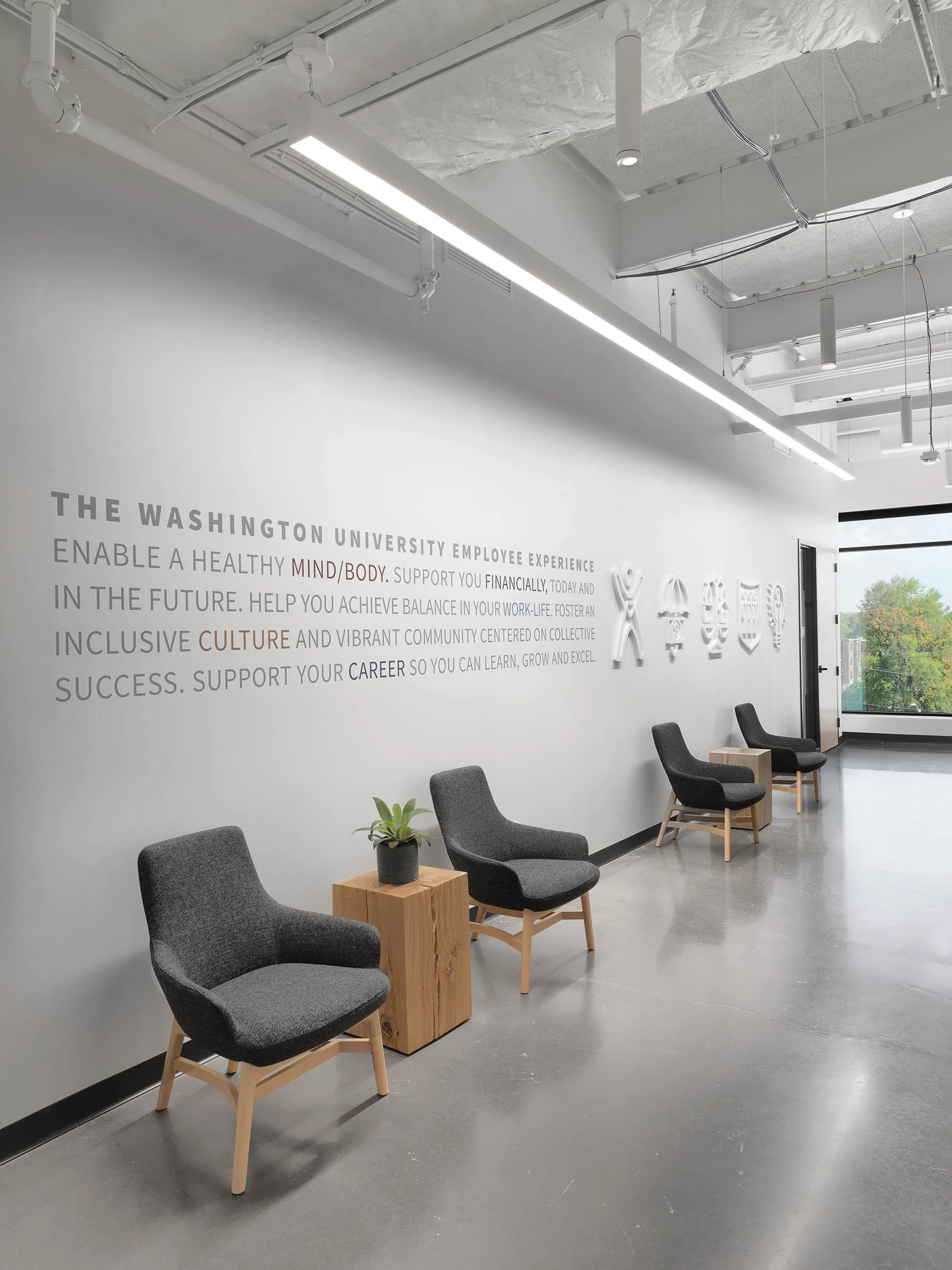 Designed around an integrative “employee experience framework,” Washington University’s Human Resource Office communicates its mission and values through a layered design approach. Concentrating on the dynamic relationship between well-being and inclusivity, graphic and interior design are utilized to create a space with robust experiential design. The reception area welcomes visitors with an installation of dimensional, tonal letters elegantly introducing this department’s five areas of focus: Mind/Body, Financial, Work-Life, Culture, Career.