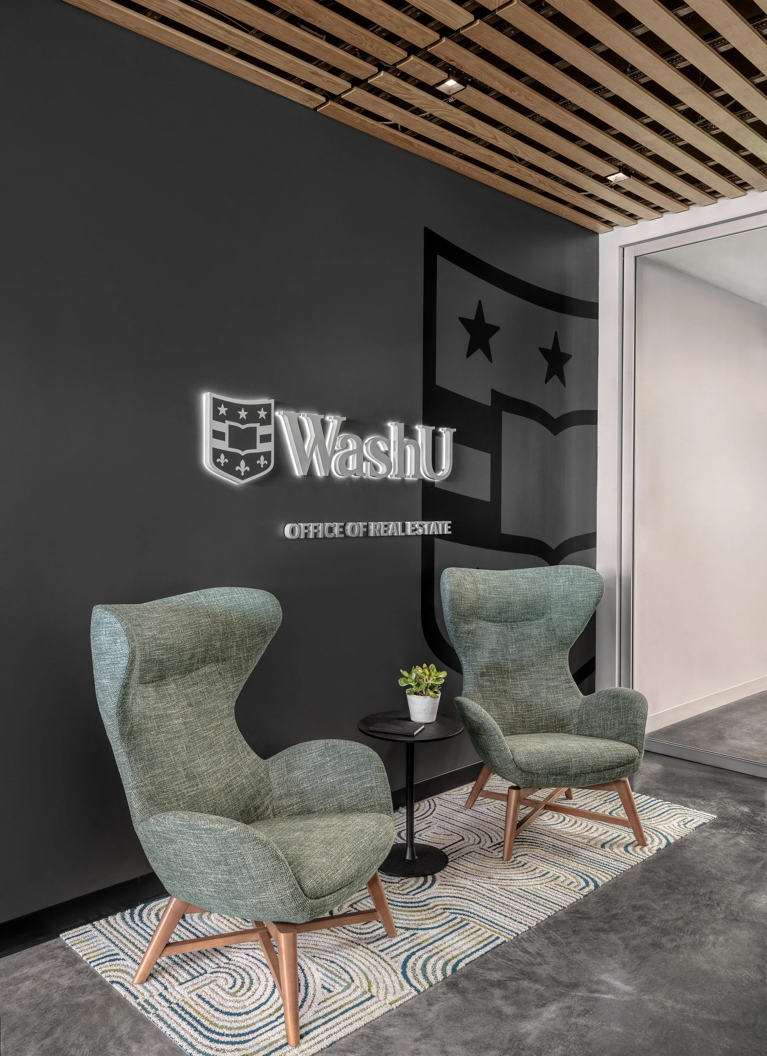 Washington University’s Quadrangle and Parallel Properties groups share a dynamic workspace at The Link Building in University City’s Loop. Although each group operates under distinct brands and functions, their separate entrances provide clear navigation for students and staff. A shared break room serves as a bridge between the two, fostering a sense of connection. Angled black grid lighting in the open office creates a unique experience, setting the space apart from typical open office designs. The overall atmosphere emphasizes vibrancy, modernity, and a welcoming environment, tailored to engage and inspire students.