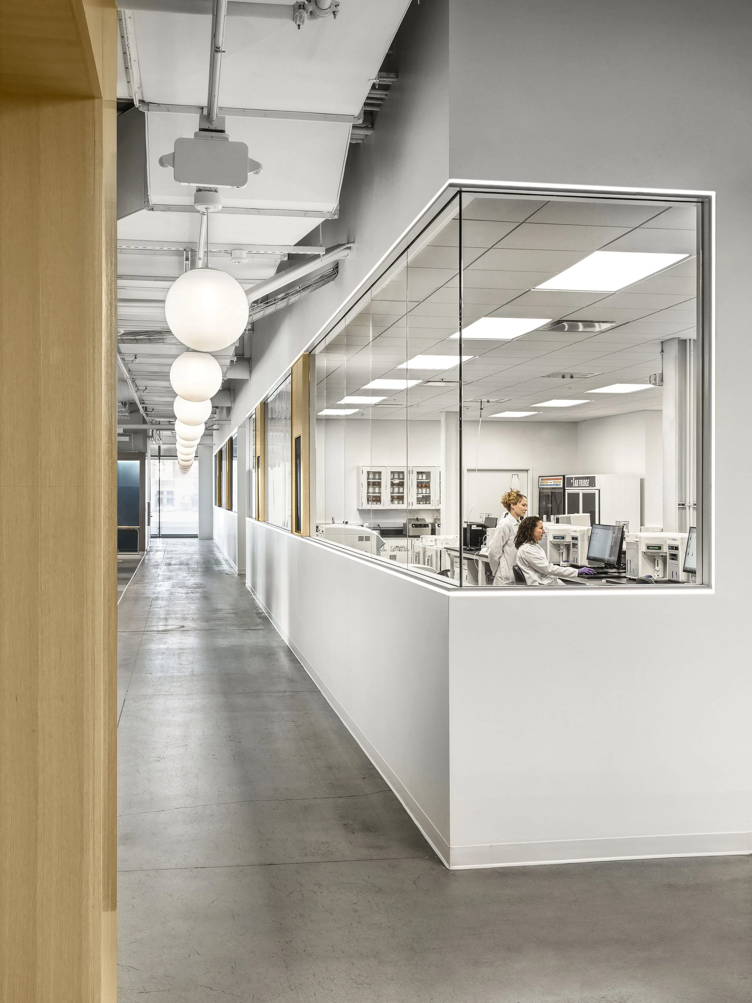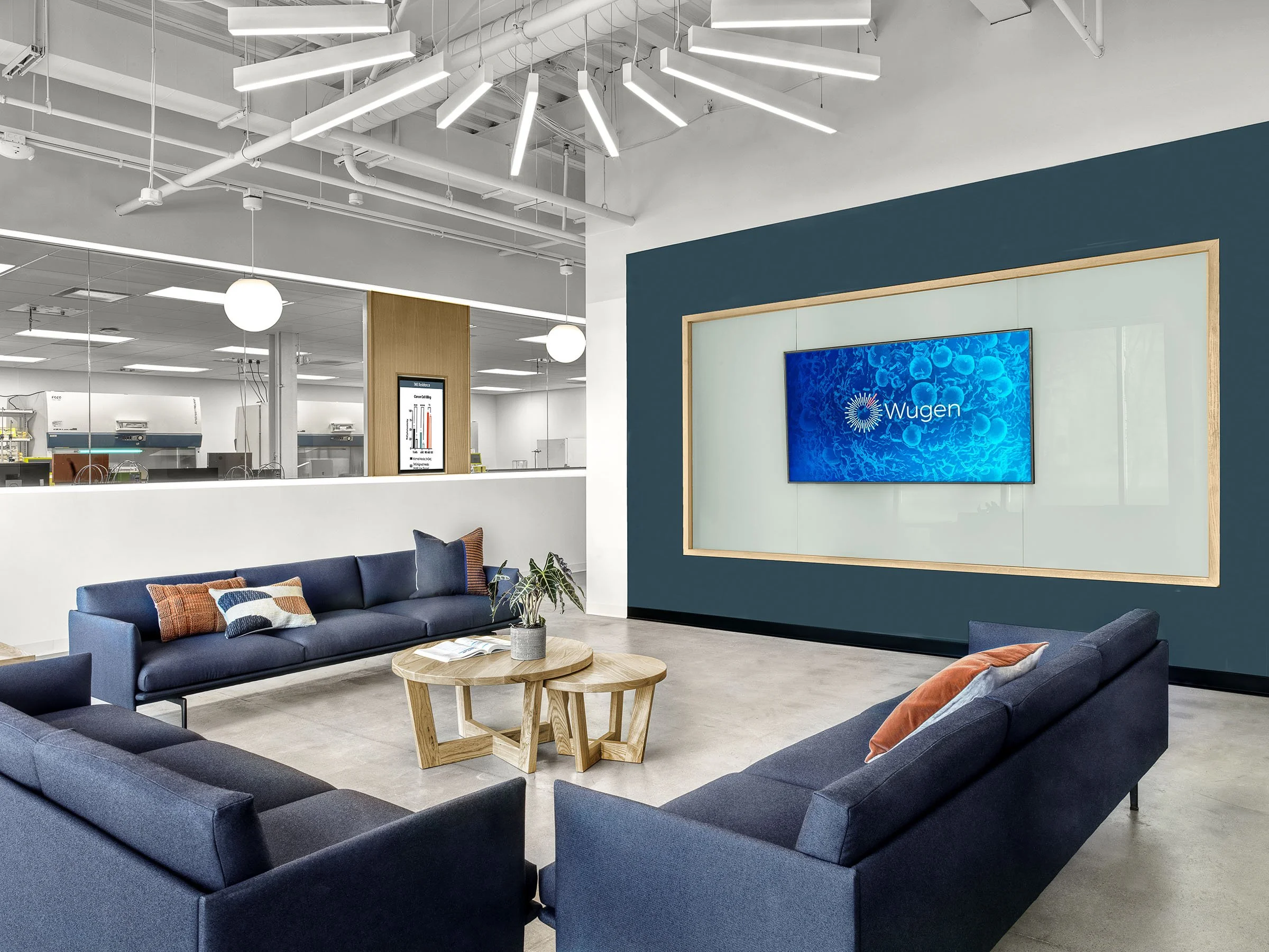 A welcoming haven for both patients and team members, the new headquarters features natural light and soft wood tones as key design drivers throughout the space. Upon entry, a large monitor provides an educational and informational narrative moment. Upholstered booths are located near the entry serving as a waiting zone and huddle space for the Wugen team. At the core of the experience is the bright white lab that is accentuated by lighting and glazing intentionally placed to highlight the processes and hands-on team behind the successful company. The board room is intentionally subdued but sophisticated, allowing Wugen’s work to be the focus of the space. And finally, the large work café serves as both a functional meeting space as well as entertainment space. A meaningful mission and client, Arcturis enjoyed working with the Wugen team to support its leading-edge work and to celebrate the “wu-factor” that defines Wugen as a company.